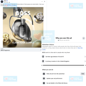 👀 Hey all! Look out for the free Boss Perfume sample ads doing the rounds on Facebook. This is a great way to show Facebook that you like free perfumes and aftershaves too. Read the image below to see who they’re looking for to see this advert.