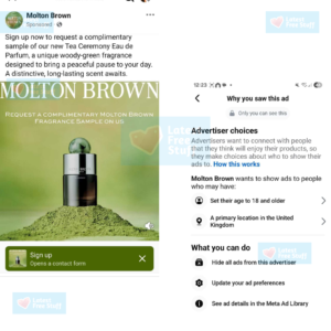 👀 Hey all! Look out for the free Molton Brown sample ads doing the rounds on Facebook. This is a great way to show Facebook that you like free fragrances too. Read the image below to see who they’re looking for to see this advert.
