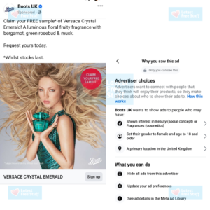 👀 Hey all! Look out for the free Versace Perfume ads doing the rounds on Facebook. This is a great way to show Facebook that you like free fragrances too. Read the image below to see who they’re looking for to see this advert.