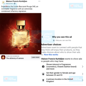 👀 Hey all! Look out for the free Mason Francis Kurkdijan Baccarat Rouge Perfume sample ads doing the rounds on Facebook. This is a great way to show Facebook that you like free perfume too. Read the image below to see who they’re looking for to see this advert.
